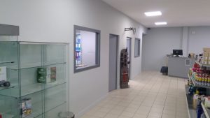 Avant la peinture du bardage, elle a déposé ancienne vitrine et porte d’entrée du magasin.Elles ont été   remplacés par 2 vitres et une porte d’accès double avec un châssis alu, un vitrage anti effraction et anti UV limitant la pénétration de la chaleur du soleil et limitant la surchauffe.