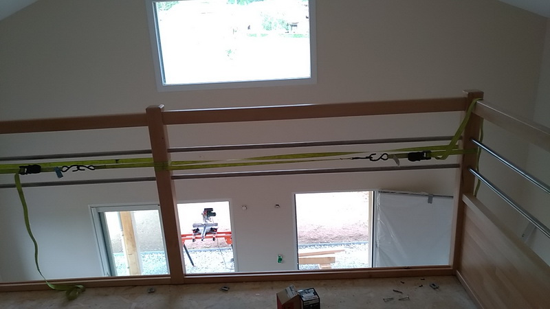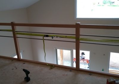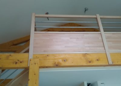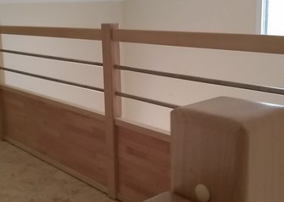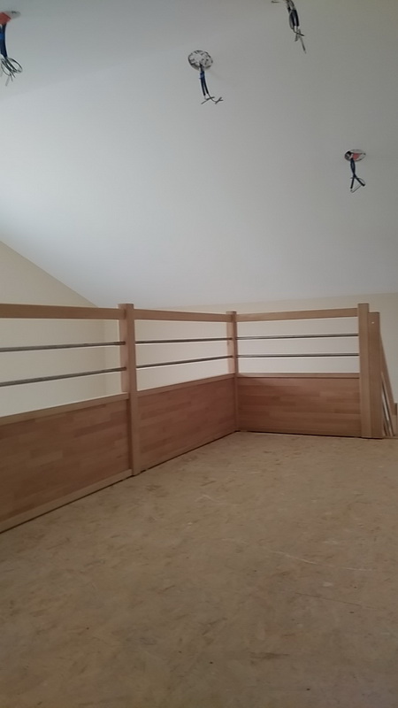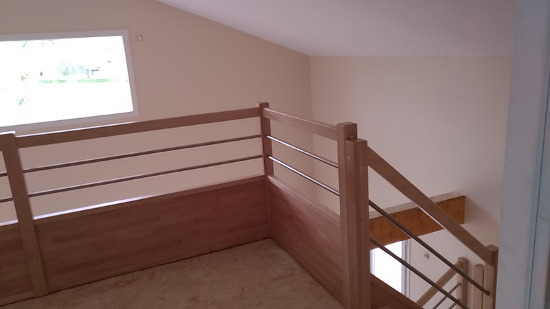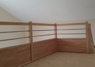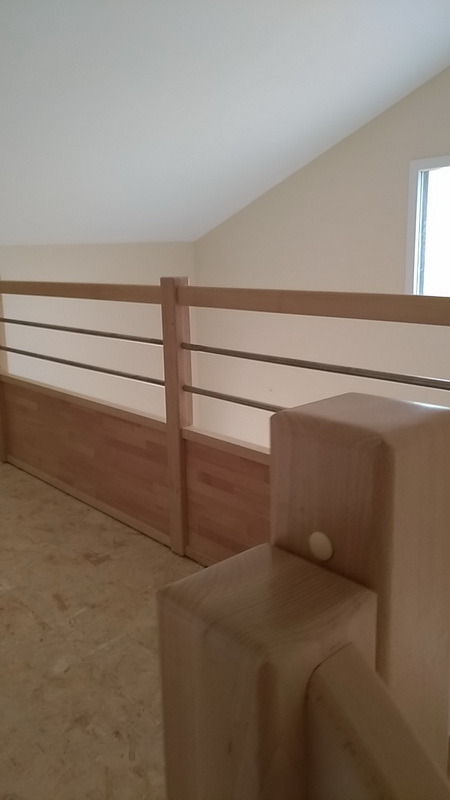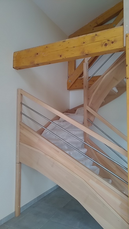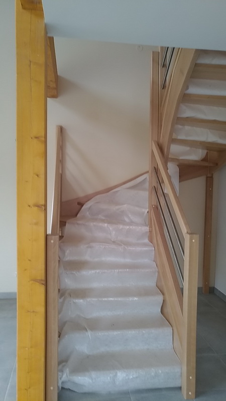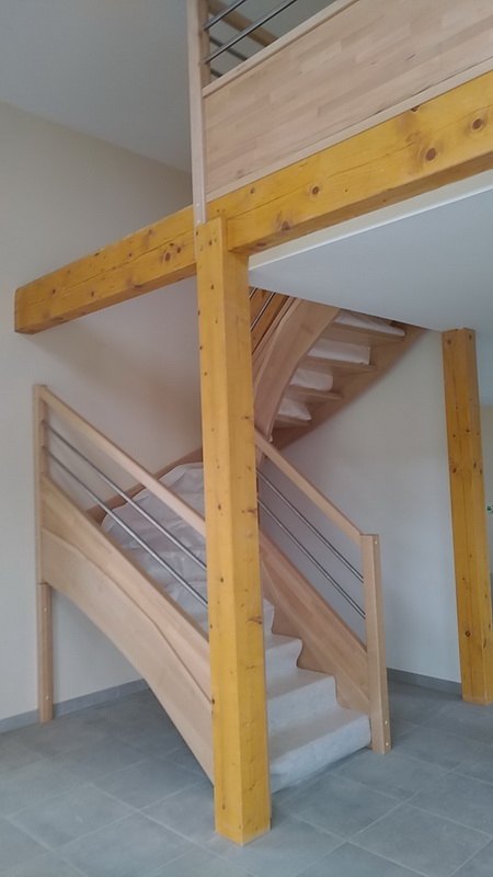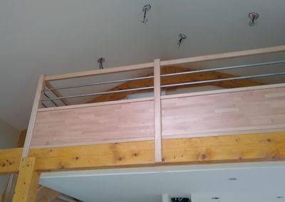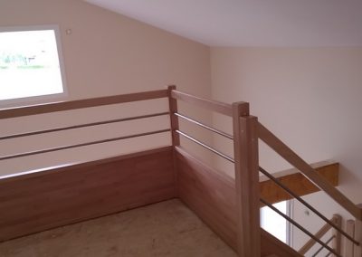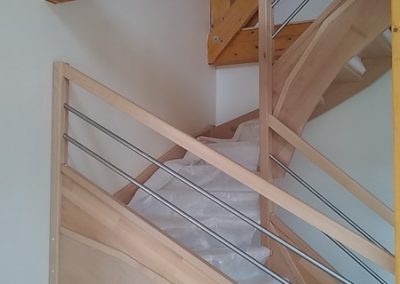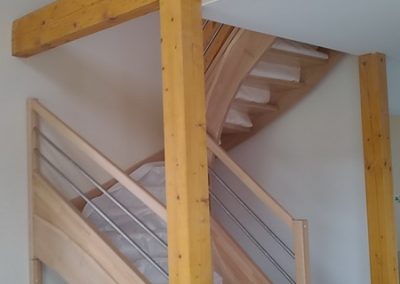 Pose d’un escalier quart tournant et d’un garde corps en hêtre et tubes inox dans un futur gîte à St Bonnet le Courreau Loire Rhône-Alpes