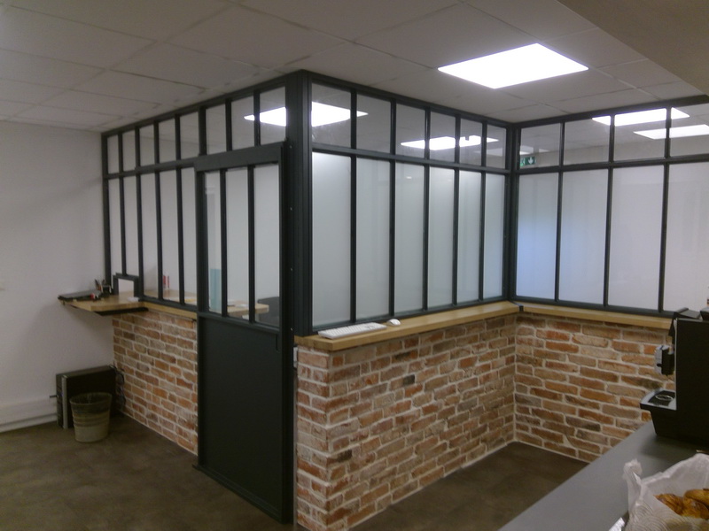 En fer laqué, gris foncé , cette verrière a été installée sur un plateau de chêne contre collé. 36 vitres dépolies à l’acide ou claires ont été posées. L’entrée se fait par la porte coulissante