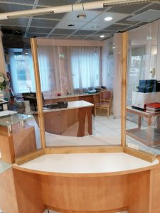 Denis Lapendry, en atelier, a conçu une protection en bois et plexiglas sur mesure. D’une dimension d’1,20m de long sur 1mètre de haut, il offrira à l’hôtesse une bonne protection contre toute projection tout en ayant un contact visuel maximum. « J’ai choisi de faire le cadre en chêne, un bois lourd qui permet de le poser sans avoir à le fixer. Je l’ai verni pour que l’ensemble se fonde avec le mobilier existant. J’espère que cette création ne sera que temporaire! conclue Denis